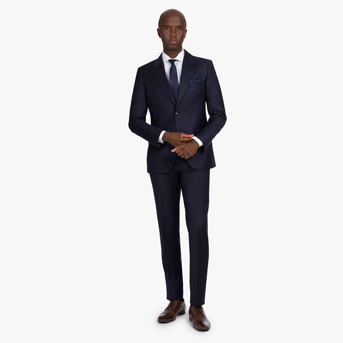 Dieser Anzug in dunkelblau besticht durch sein steigendes Revers und den leicht glänzenden Oberstoff.