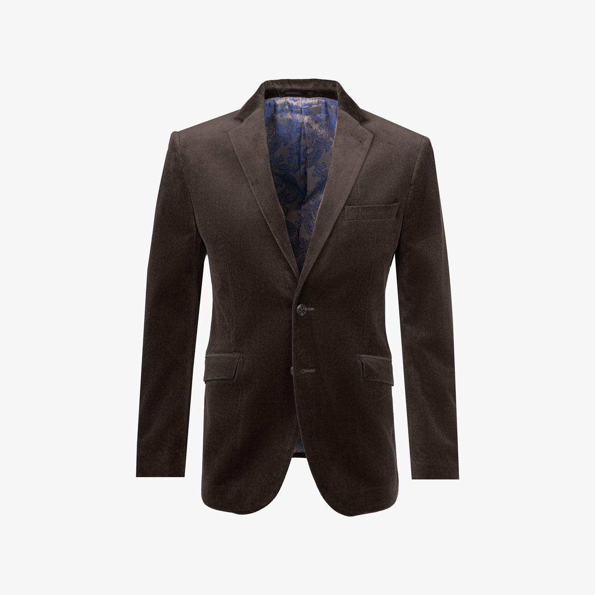 Das Sakko mit fallendem Revers ist aus reinem Baumwollsamt gefertigt. Schräg gestellte Taschen verleihen ihm eine dynamische Optik.