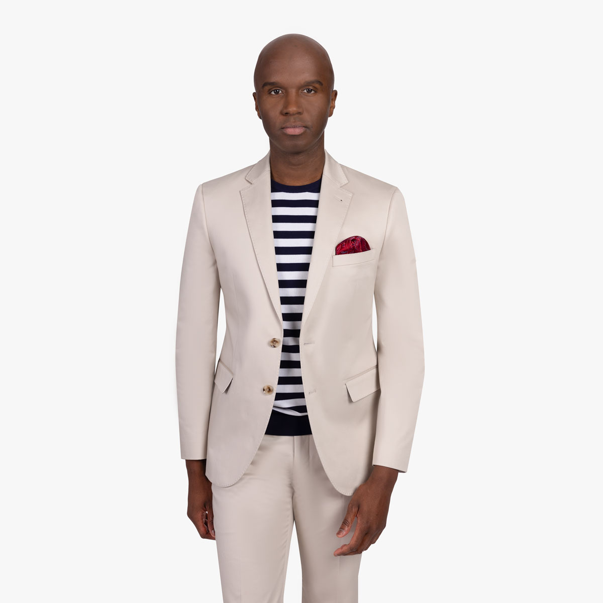 Der Baukastenanzug Genf in hellem Beige ist gefertigt aus hochwertiger Baumwolle mit 3% Elasthan für ein komfortables Tragegefühl.
