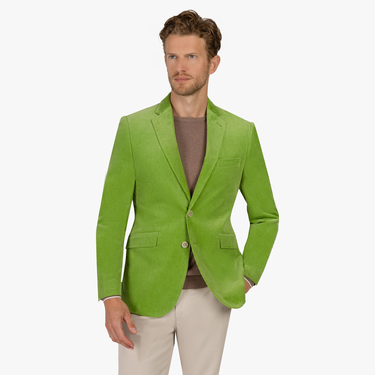 Stellen Sie sich die Größe vom Sakko und der Hose dieses Baukastenanzugs individuell selbst zusammen. Der Baukastenanzug in dem frischen grasgrün ist ein echter Hingucker und fühlt sich durch den weichen Cordstoff besonders angenehm auf der Haut an.
