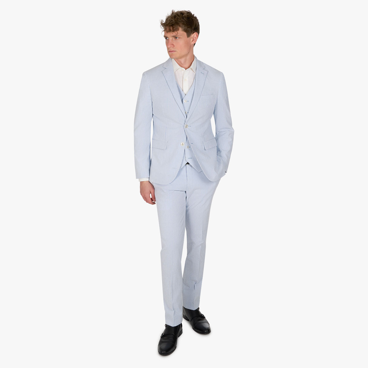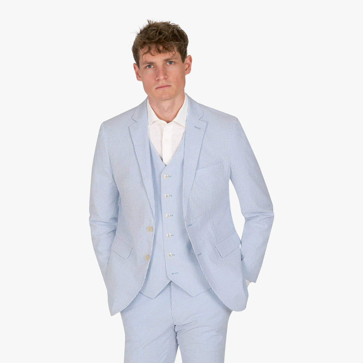 Baukastenanzug mit Seersucker Struktur in Hellblau gestreift