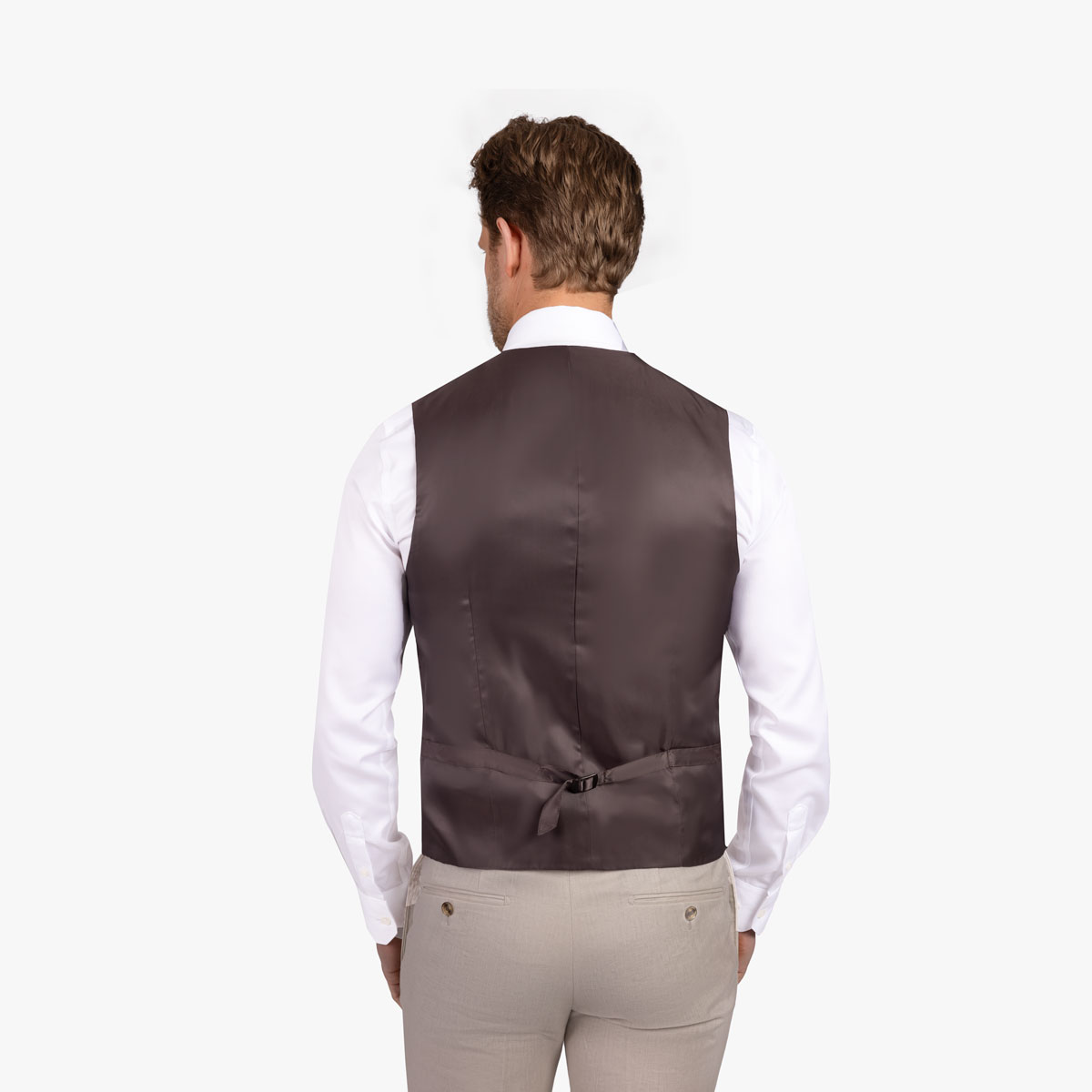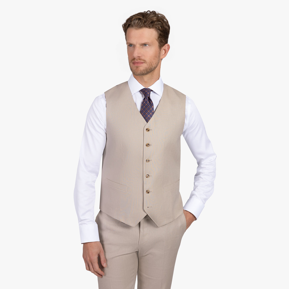 Der Oberstoff des dreiteiligen Baukastenanzugs in beige besteht zu 100% aus Leinen. Das Sakko hat ein luftiges Halbfutter, welches dafür sorgt, dass die angenehmen und temperaturregulierenden Eigenschaften des Leinens besonders gut zur Geltung kommen können.