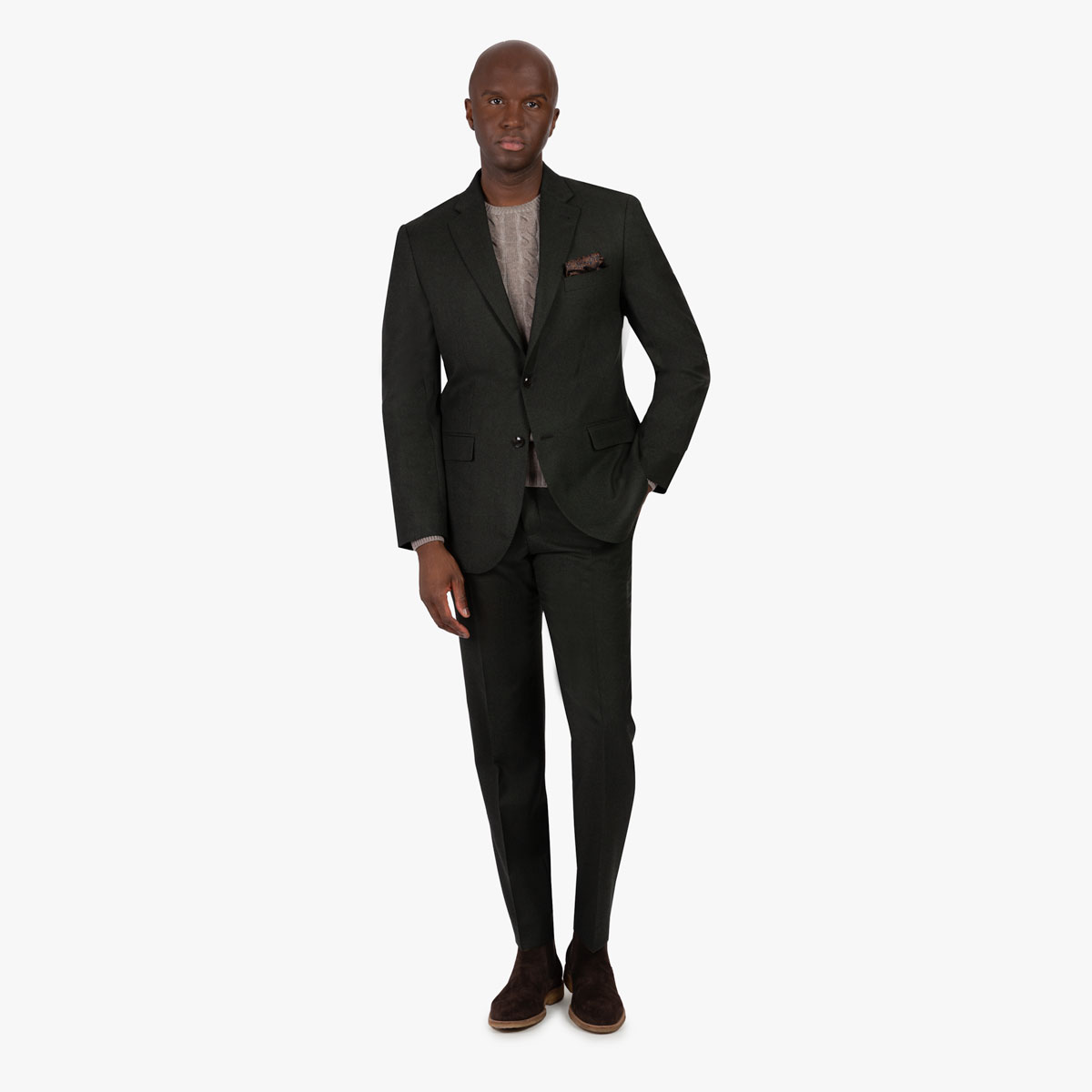 Der Modern Fit Baukastenanzug in dunkelgrün besteht aus reiner Wolle in S 100er Qualität.