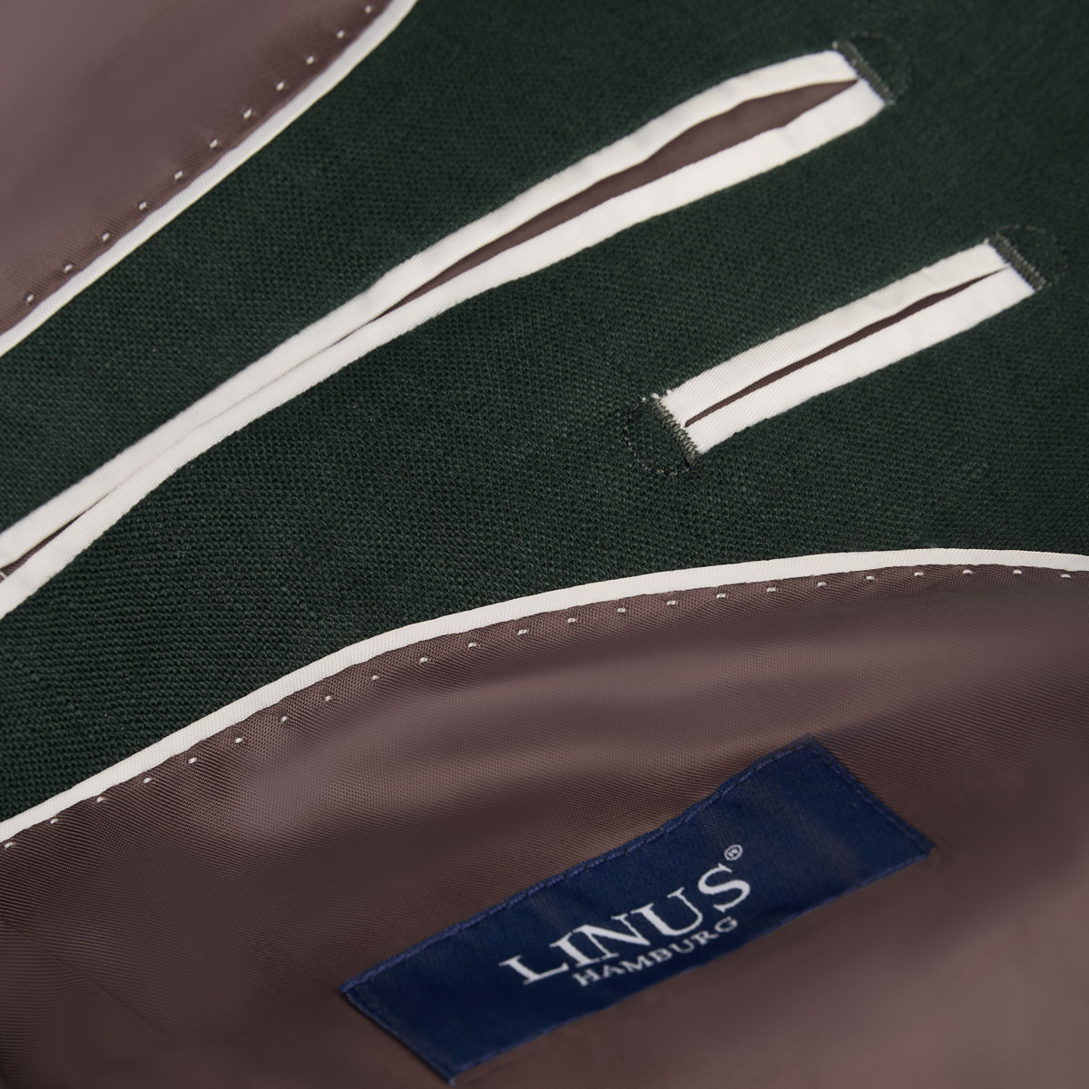 Der Oberstoff des Baukastensakkos in dunkelgrün besteht aus reinem Leinen. Das Sakko hat ein luftiges Halbfutter, welches dafür sorgt, dass die angenehmen und temperaturregulierenden Eigenschaften des Leinens besonders gut zur Geltung kommen können.