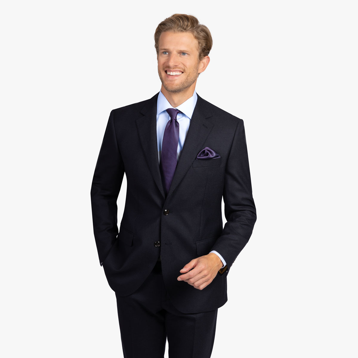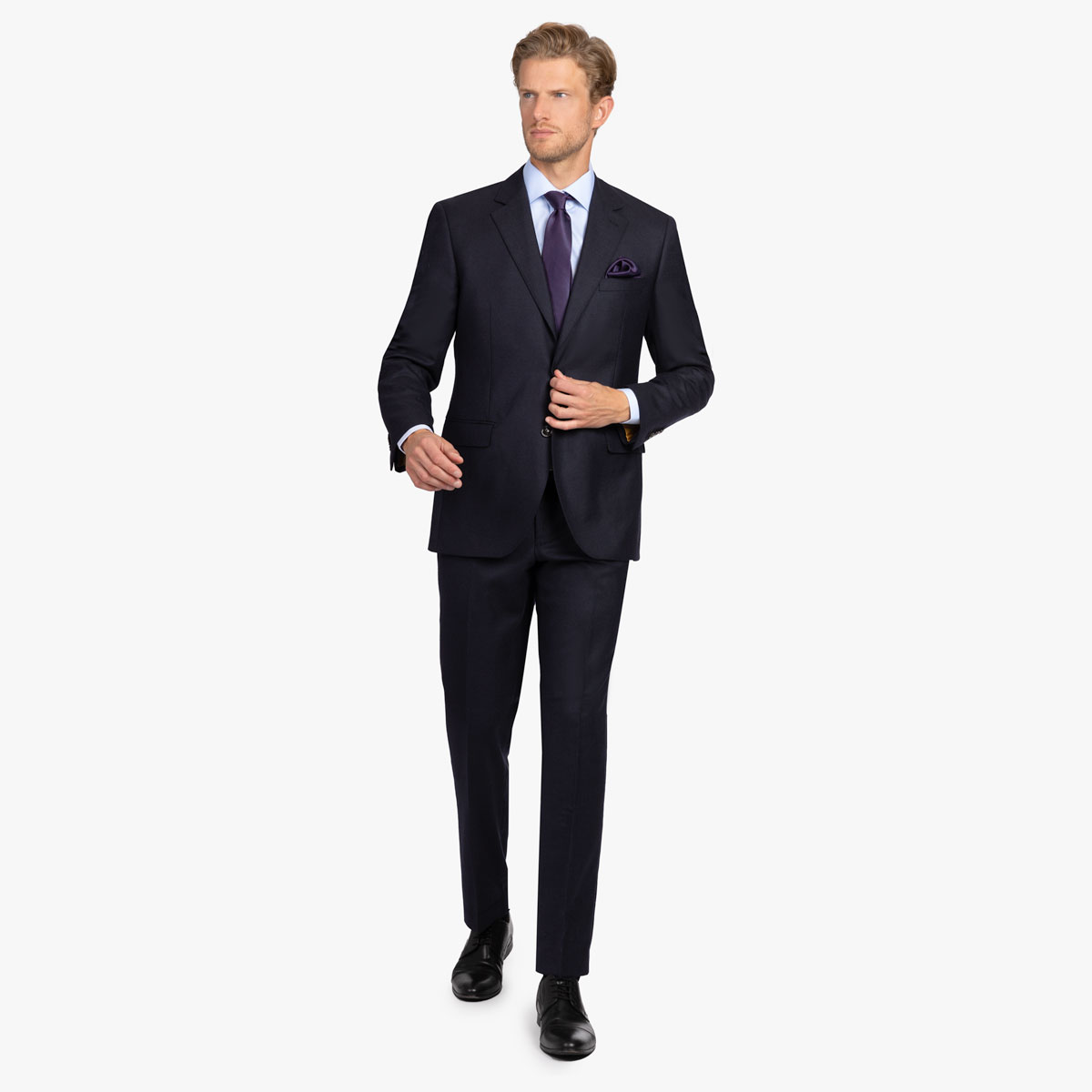 Der Oberstoff des dunkelblauen Modern Fit Sakkos besteht aus reiner Wolle in S 120's Qualität. Das Innenfutter trägt ein zeitloses Paisley-Muster in blau und gold.