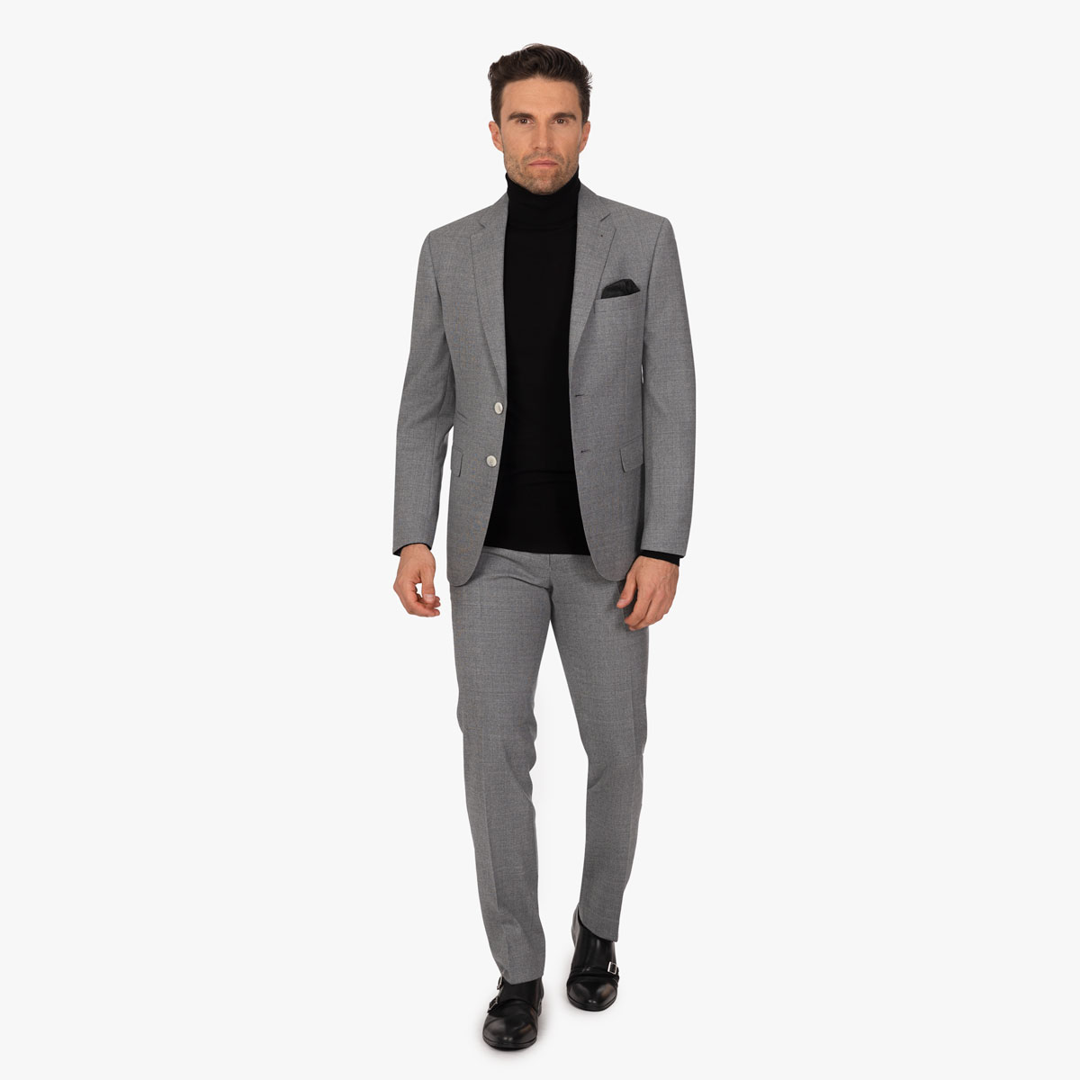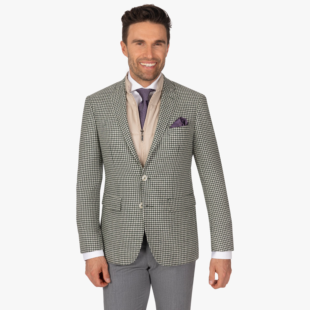 Der Hahnentritt, auch Pepita genannt, ist ein auffälligeres Muster, das durch seine kleinen, kontrastierenden Karos sofort ins Auge sticht. Im Business-Umfeld sollte dieses Muster dezent gewählt werden, um nicht zu dominant zu wirken. In neutralen Farben wie Schwarz-Weiß oder Grau kann ein Hahnentritt-Anzug einen eleganten und gleichzeitig einzigartigen Akzent setzen, der Stilbewusstsein und Individualität ausdrückt.