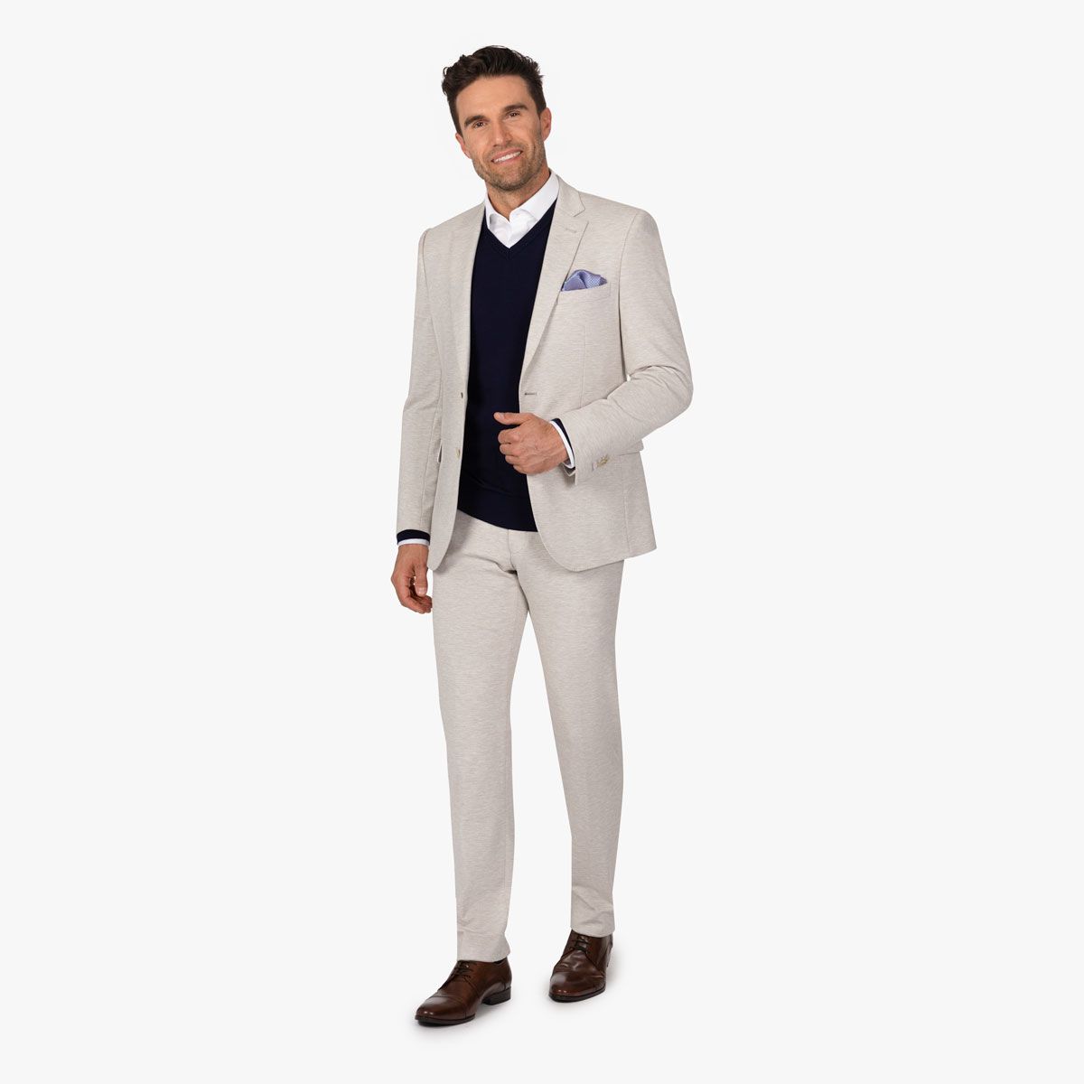 Anzüge aus Materialmischungen bieten eine perfekte Balance zwischen Eleganz und Funktionalität. Oft werden Naturfasern wie Schurwolle mit synthetischen Fasern wie Polyester oder Elasthan kombiniert, um die Vorteile beider Materialien zu nutzen. Schurwolle verleiht dem Anzug eine edle Optik, sorgt für Temperaturausgleich und ist knitterarm, während synthetische Anteile für Formbeständigkeit und Langlebigkeit sorgen. Bei hochwertigen Anzügen wird oft auch Kaschmir beigemischt, was das Material besonders weich, luxuriös und angenehm auf der Haut macht. Anzüge aus solchen Mischungen bieten exzellenten Tragekomfort, halten ihre Form und wirken stets professionell – ideal für lange Arbeitstage oder Geschäftsreisen.