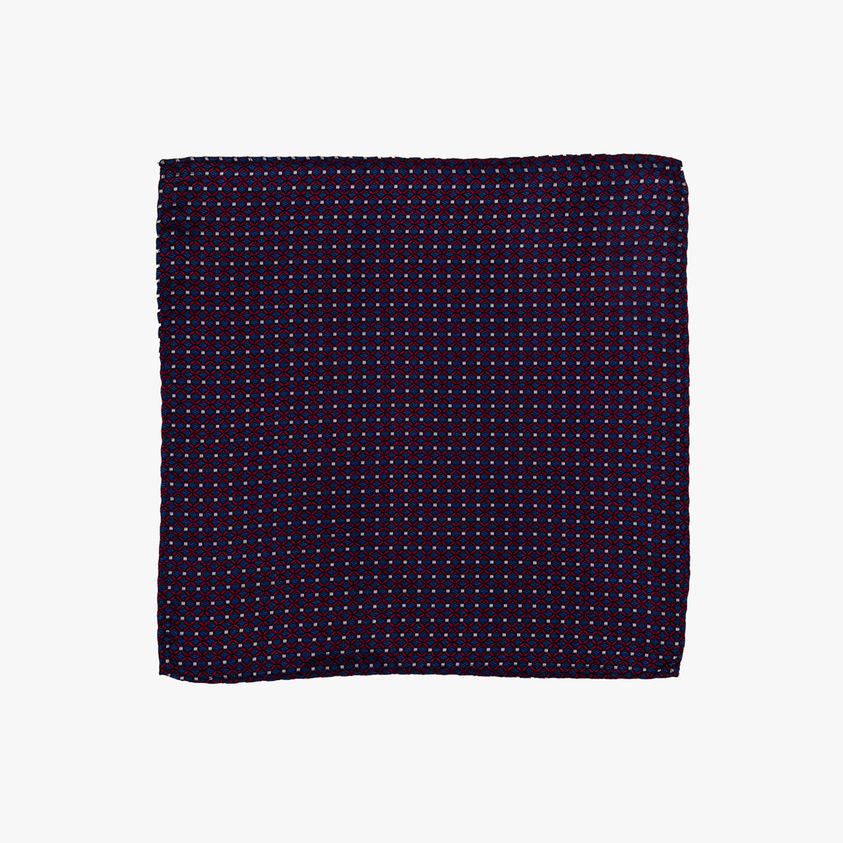 Das Einstecktuch besticht durch die edle dunkelblaue Farbe im Zusammenspiel mit einem geometrischen Muster in Rot. Die silbernen Akzente geben dem Einstecktuch einen hauch Frische.