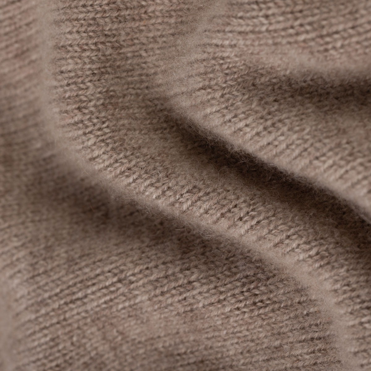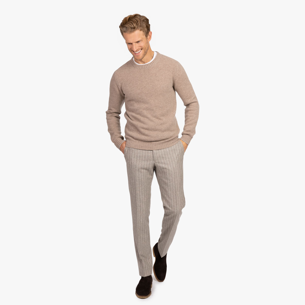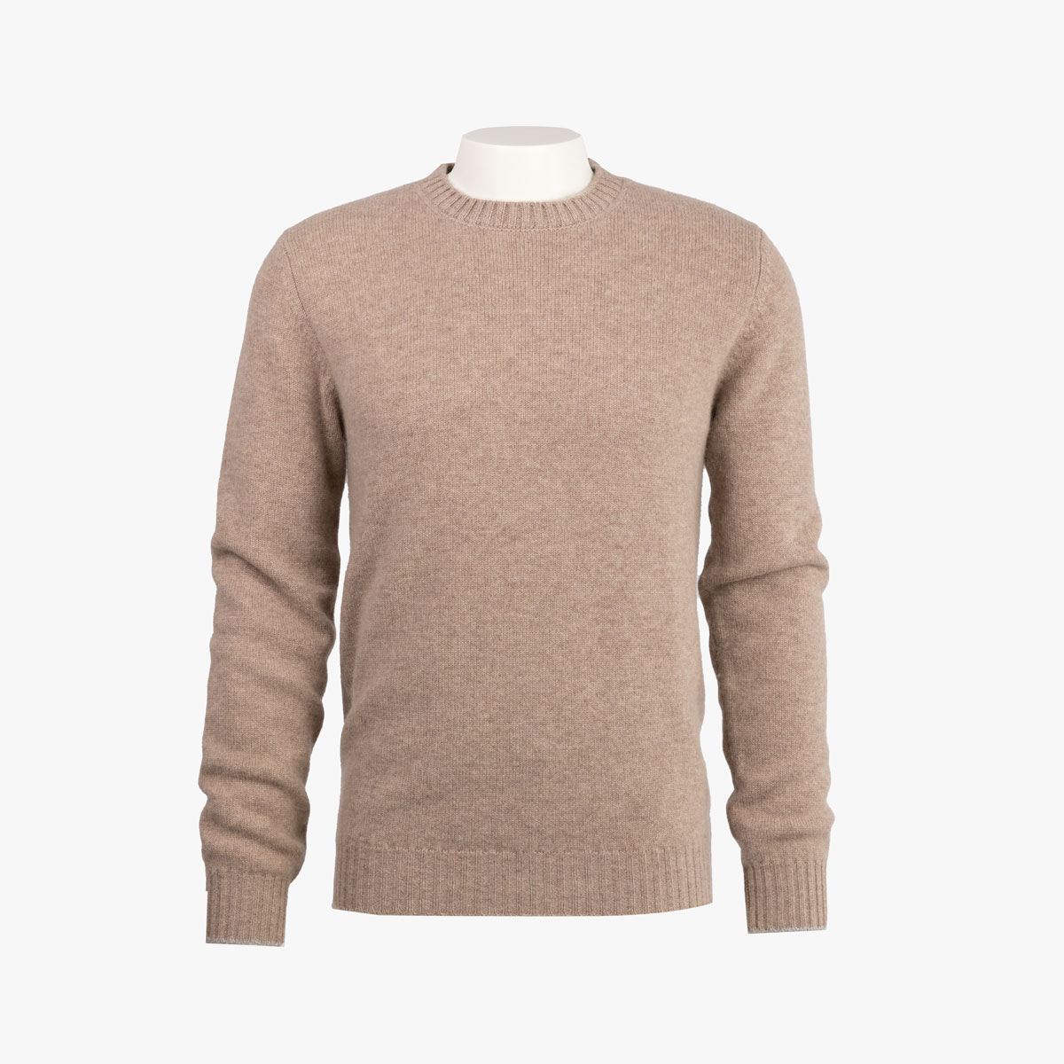 Der hellbraune Feinstrickpullover besteht aus einem hochwertigen und sehr weichen Strick aus reinem Kaschmir.