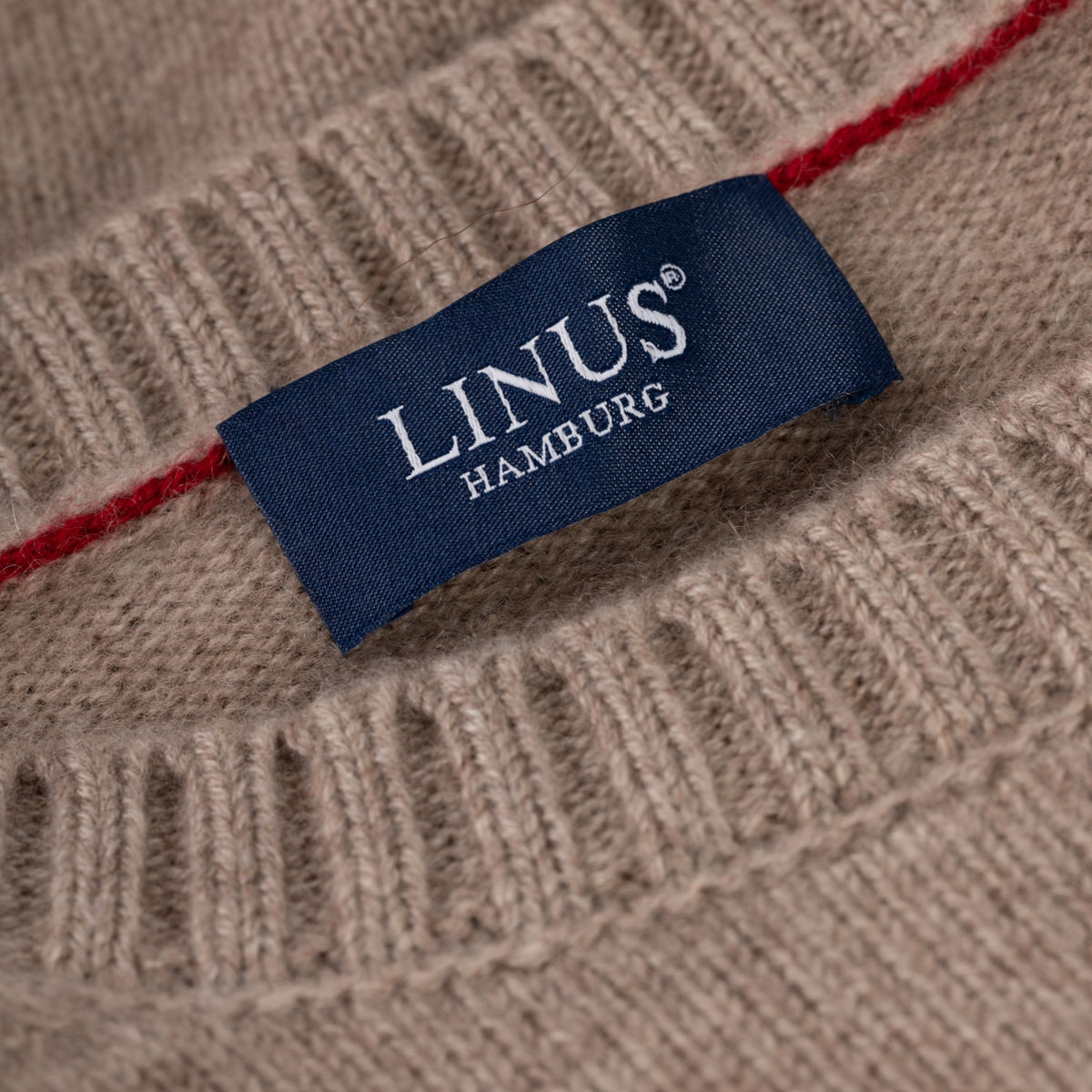 Er hat einen Rundhalsausschnitt und Rippstrick an den Abschlüssen. Ein feiner grauer Streifen ziert zusätzlich die Ärmelabschlüsse.