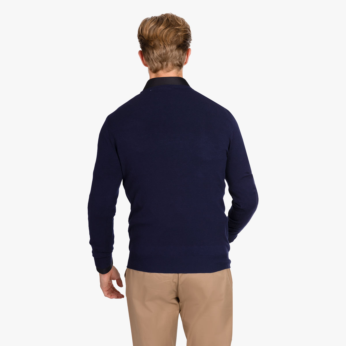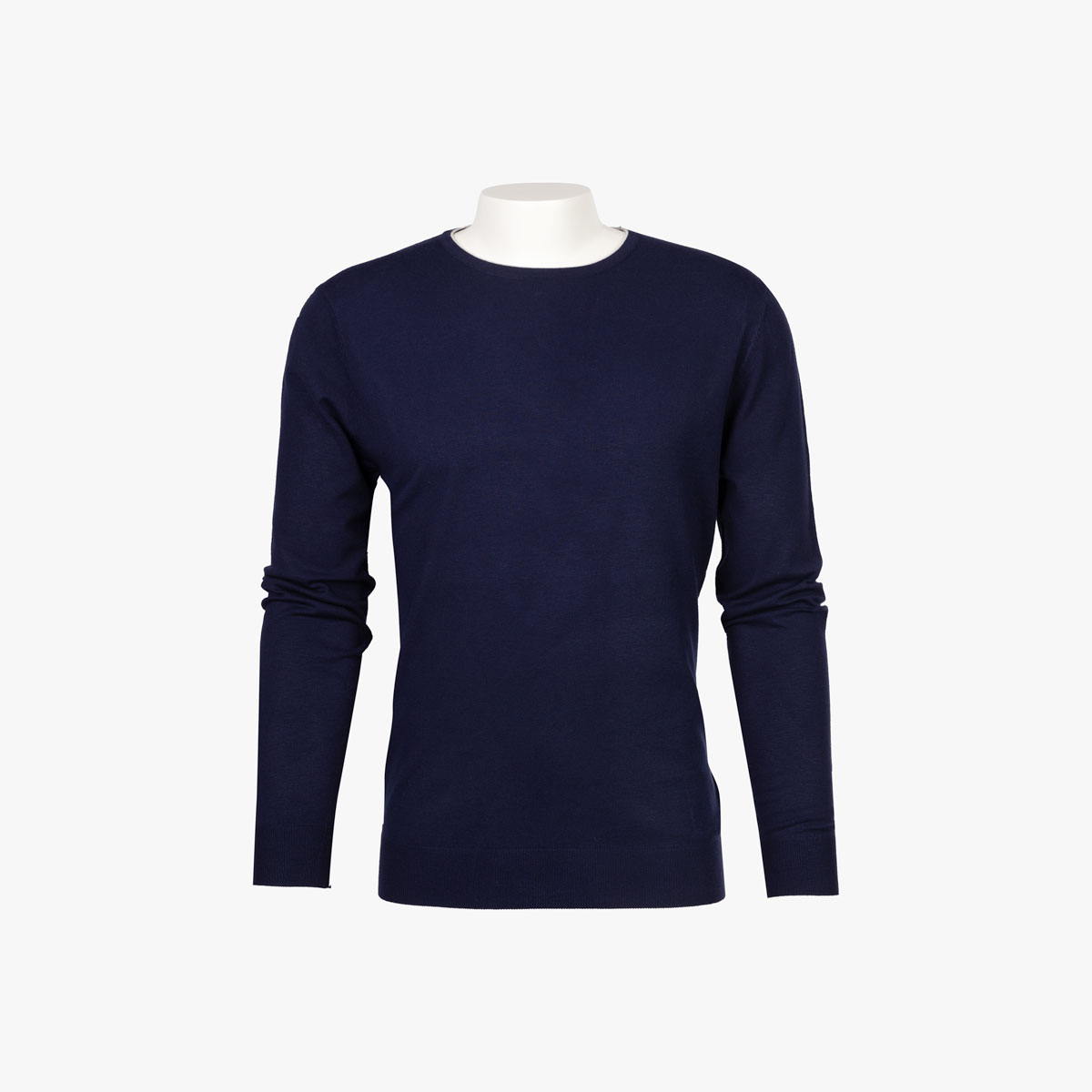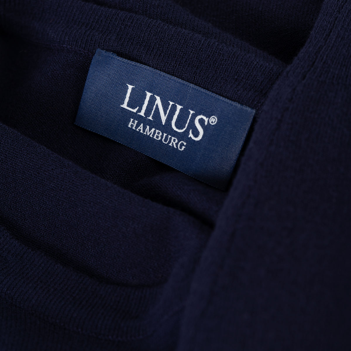 Der dunkelblaue Feinstrickpullover lässt sich vielseitig kombinieren und ist sehr trageangenehm.