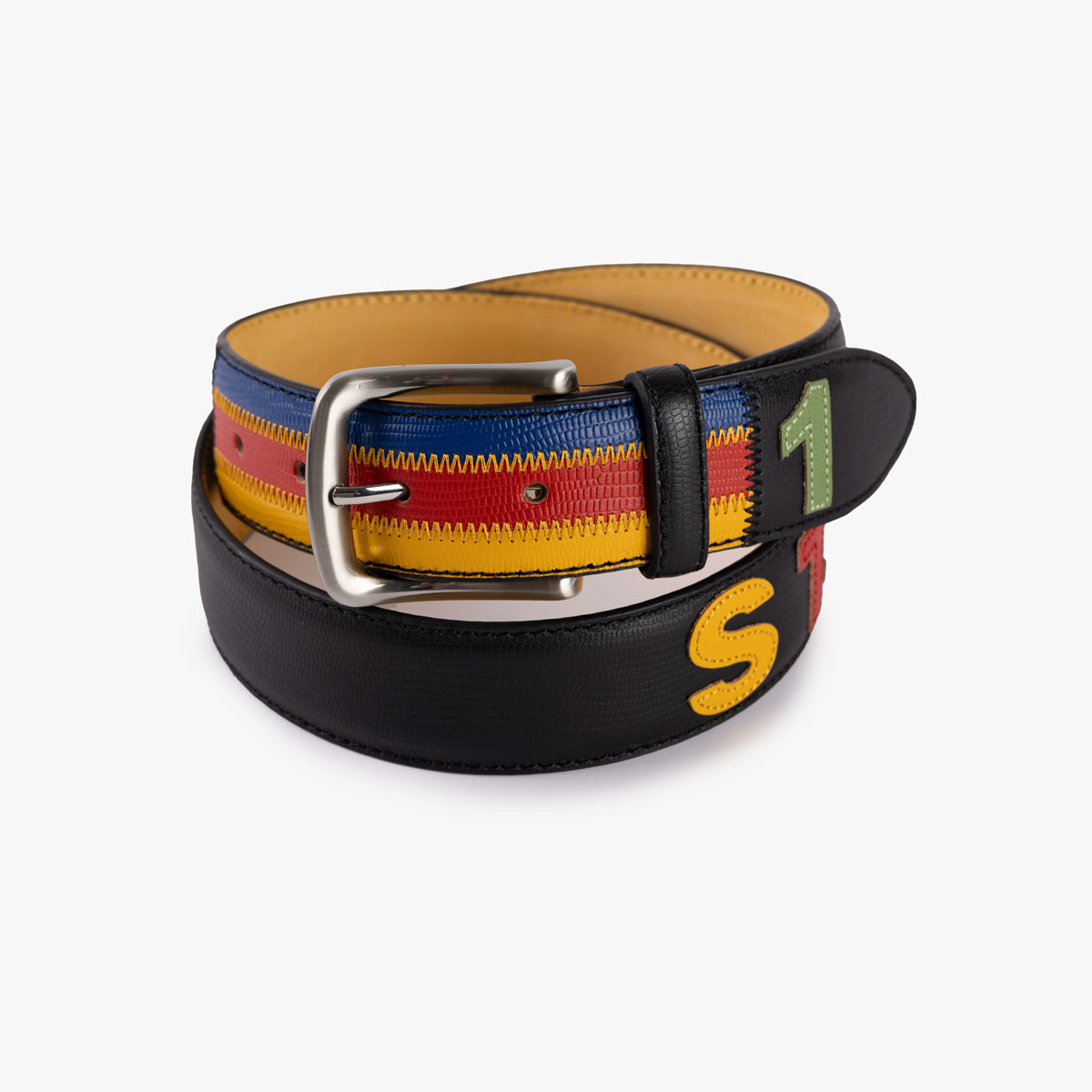 Der Gürtel ist aus echtem schwarzem Glattleder mit aufgedrucktem Schlangenhautmuster. Auf die Außenseite ist ein aufgenähter Schriftzug von "St. Barth" in bunten Farben. Die breite, robuste Schnalle aus silbernem Metall und das feine Muster auf dem Leder veredelt den Look des Gürtels.