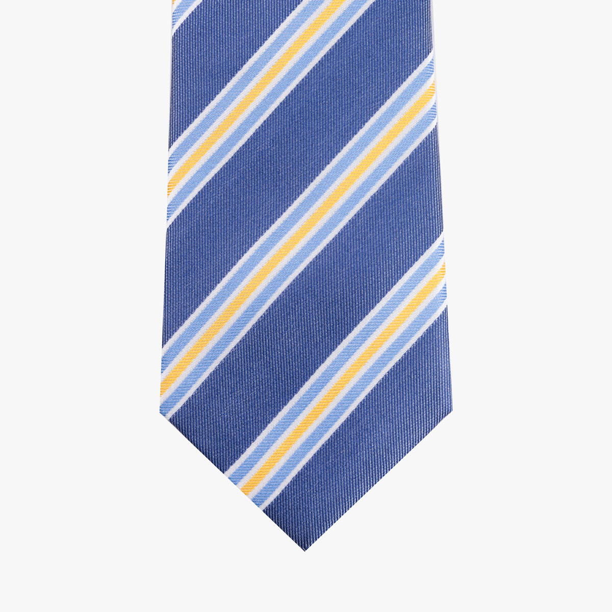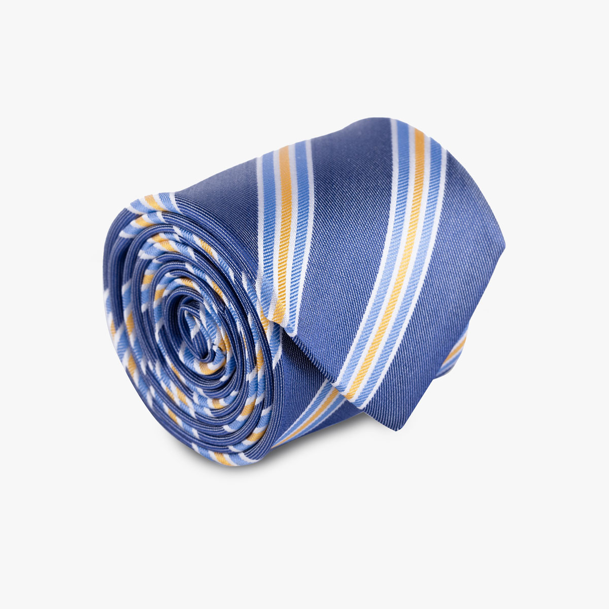 Die Krawatte ist aus hochwertiger reiner Seide. Die Streifen sind ein klassisches Muster in der Herrenbekleidung und geben Ihren Outfits Struktur. Die dunkelblaue Grundfarbe im Zusammenspiel mit den hellblauen, gelben und weißen Streifen sorgt für vielfältige Kombinationsmöglichkeiten.