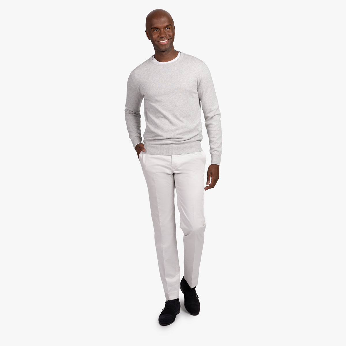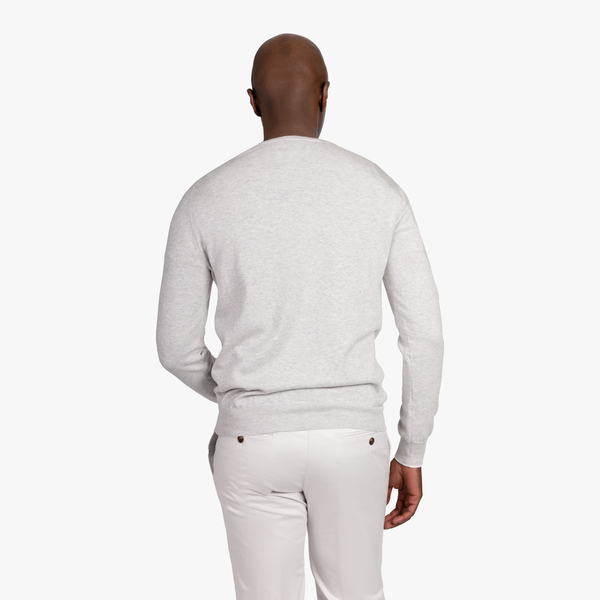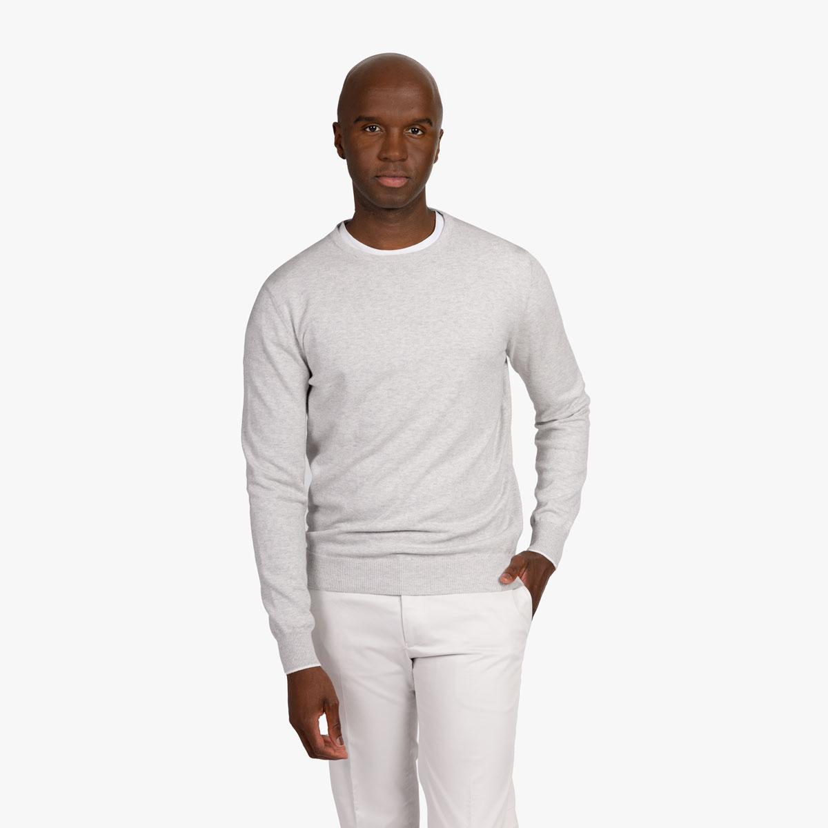 Der hellgraue Strickpullover mit Rundhals-Ausschnitt lässt sich hervorragend mit anderen Kleidungsstücken kombinieren und layern.