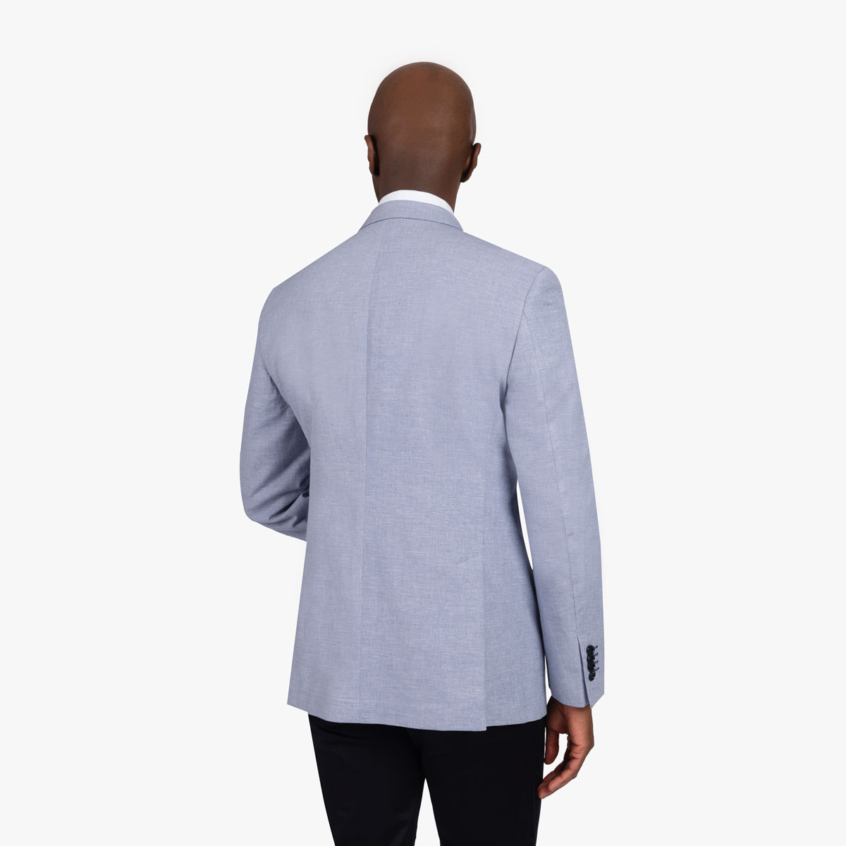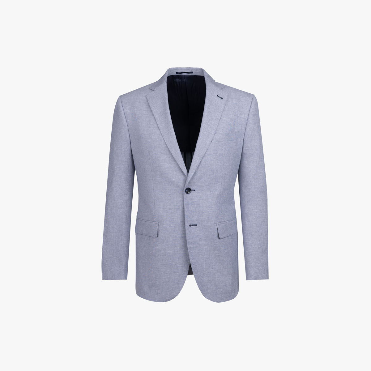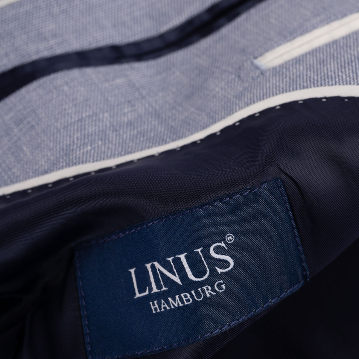 Das mittelblaue Sommersakko aus Baumwolle, Leinen und Elastan bietet stilvollen Tragekomfort. Die Materialmischung sorgt für Leichtigkeit und Flexibilität.