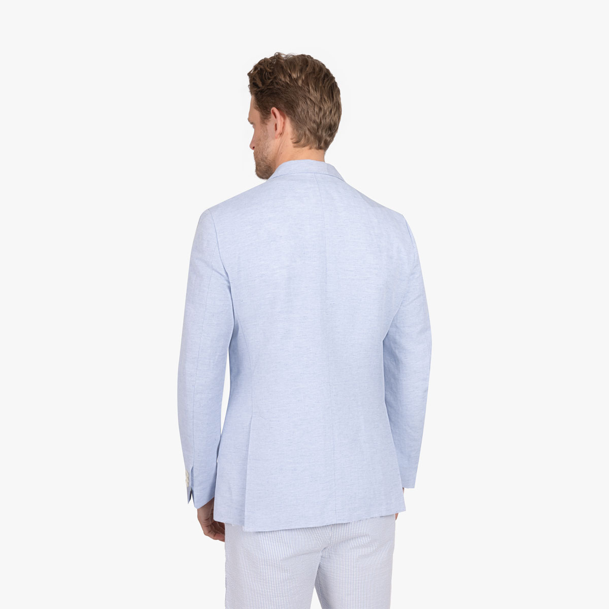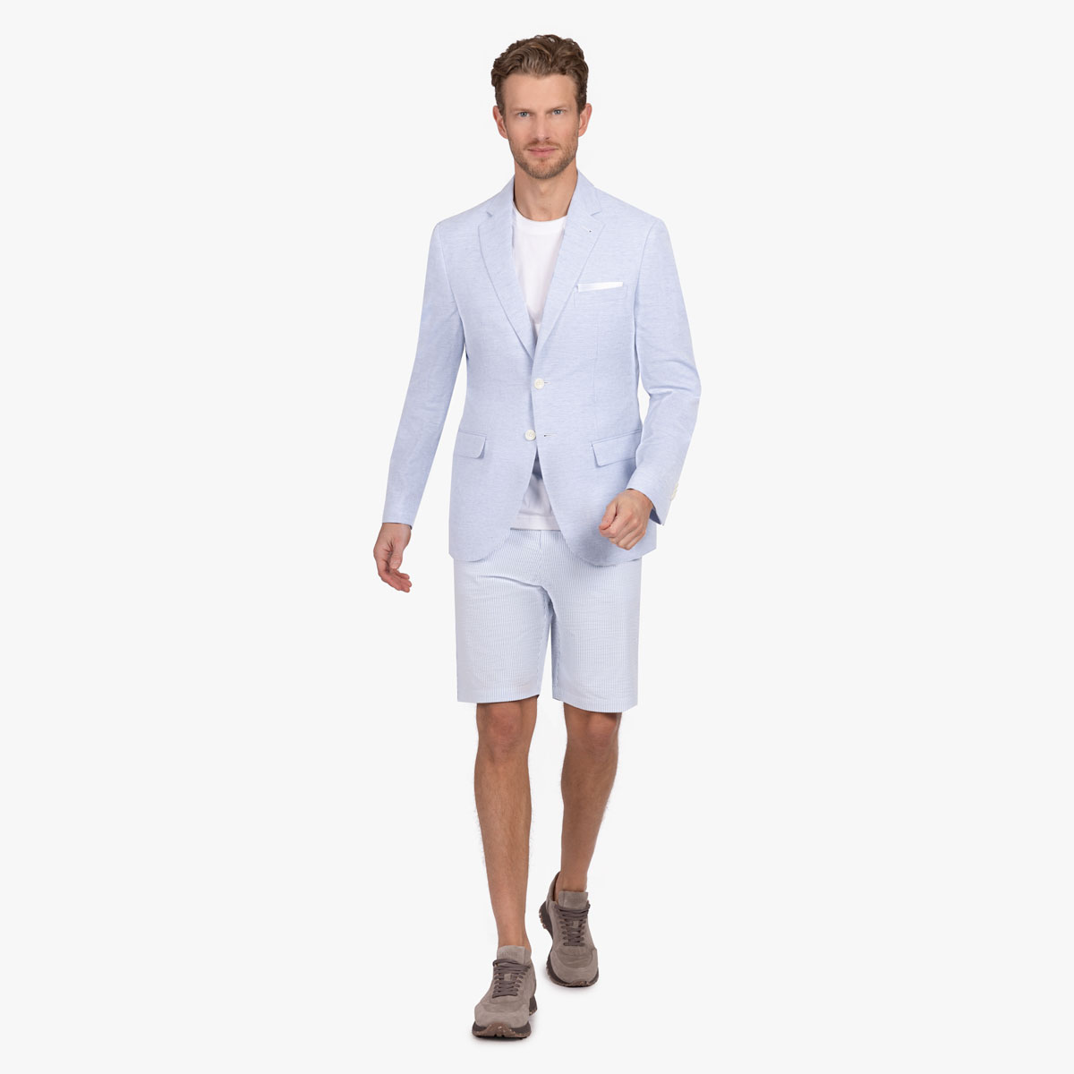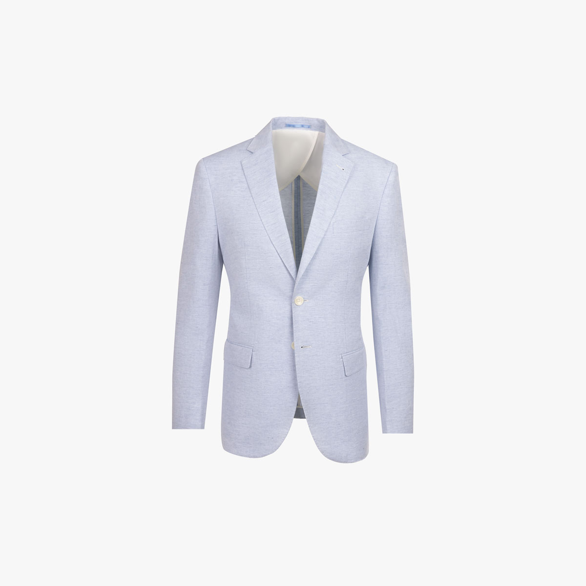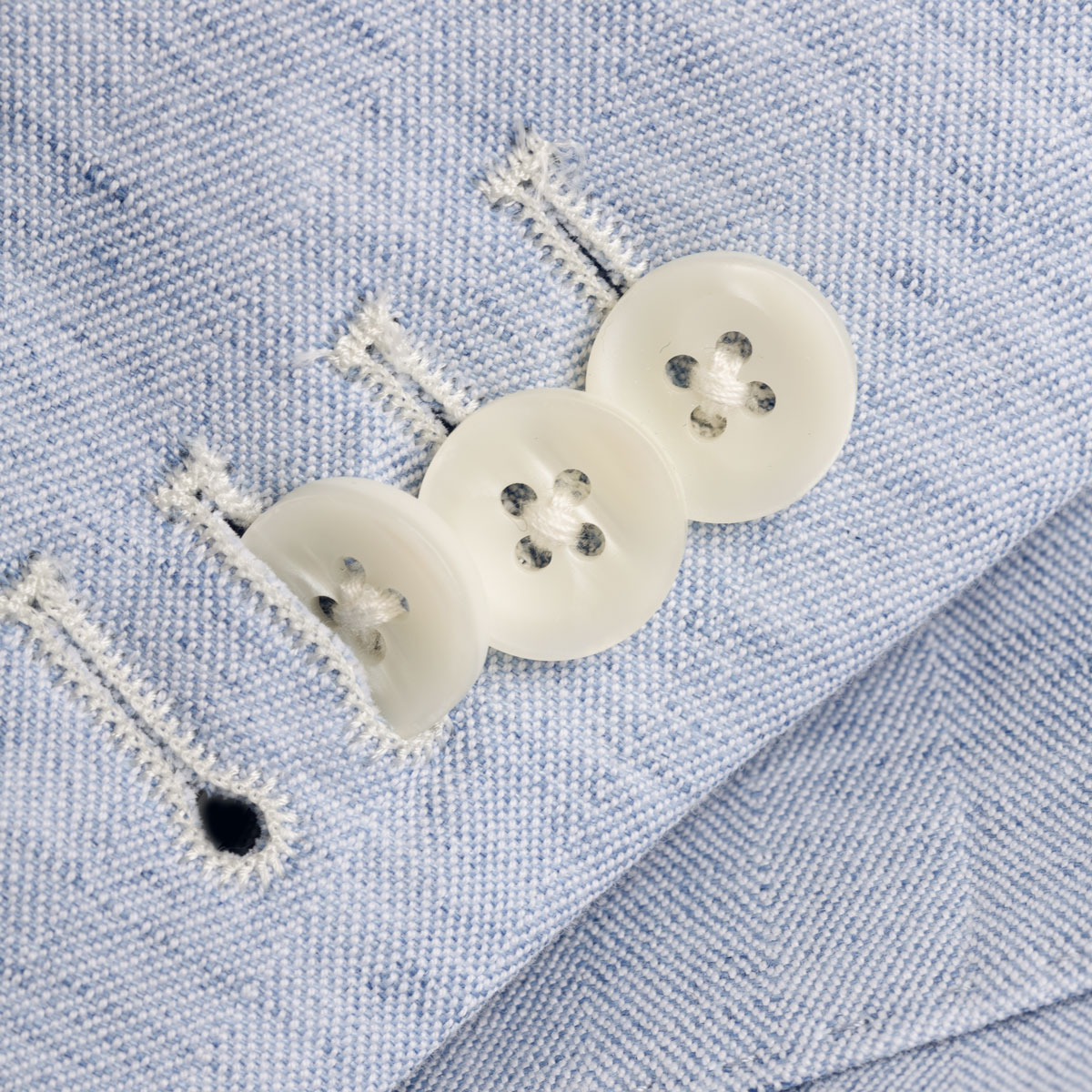 Das Sakko Prato in hellblauer Farbe ist gefertigt aus einem hochwertigen Baumwoll-Leinen-Mix der Weberei Lanificio Angelico. In den Oberstoff ist ein feines Fischgratmuster eingearbeitet, das dem Sakko und der Farbe eine besondere Note veleiht.