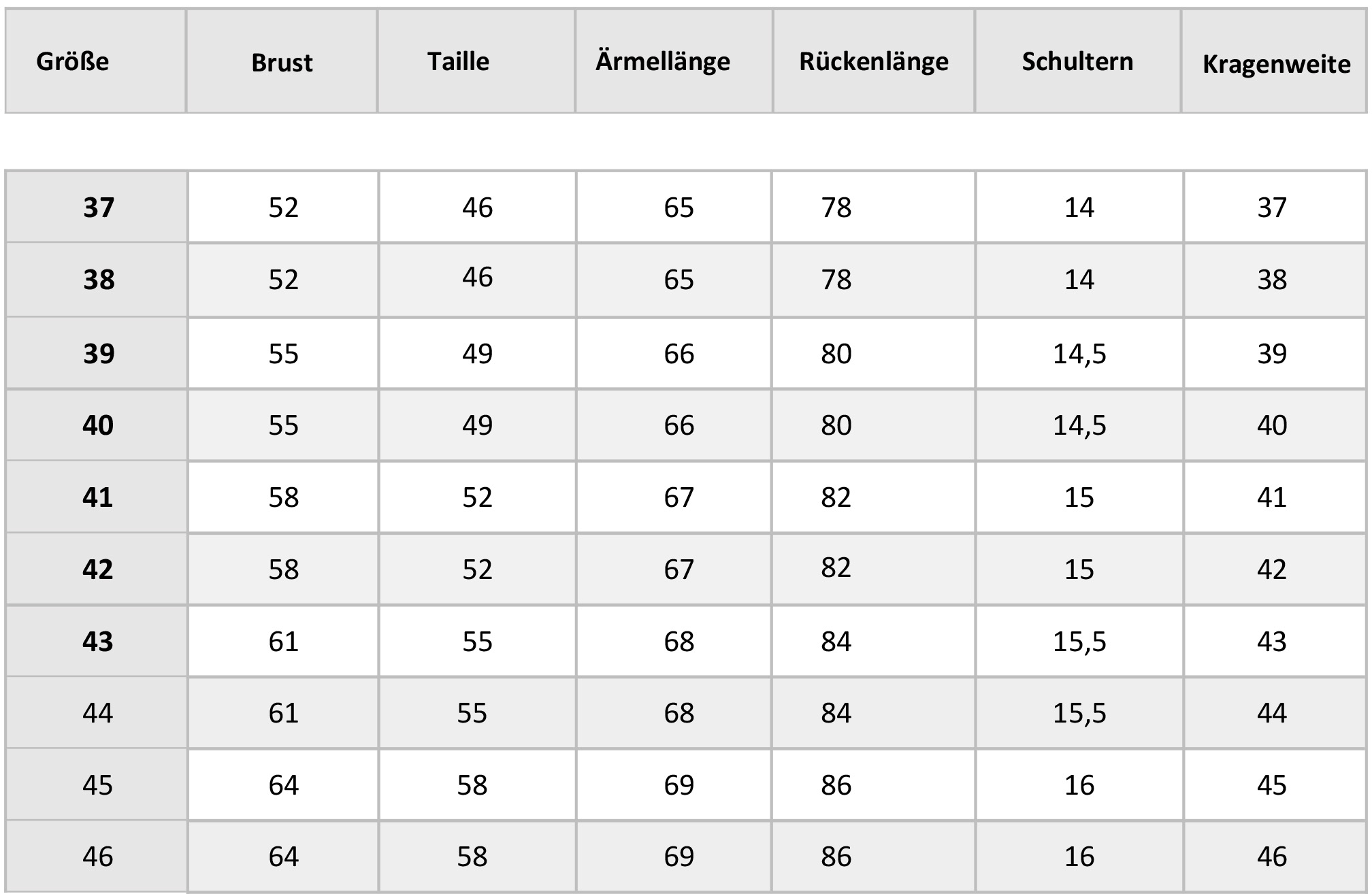 Normalerweise werden diese am Körper genommen. Da beim Online-Einkauf jedoch nicht immer eine zweite Person mit Maßband in der Nähe ist, empfehlen wir Ihnen, an einem gut sitzenden Hemd zu messen, welches sich bereits in Ihrem Kleiderschrank befindet.