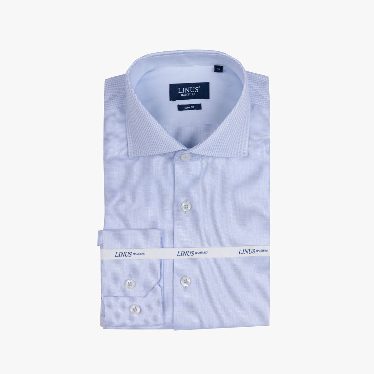 Besonders ist das eingewebte hellblaue Muster im gesamten Stoff des Hemdes.