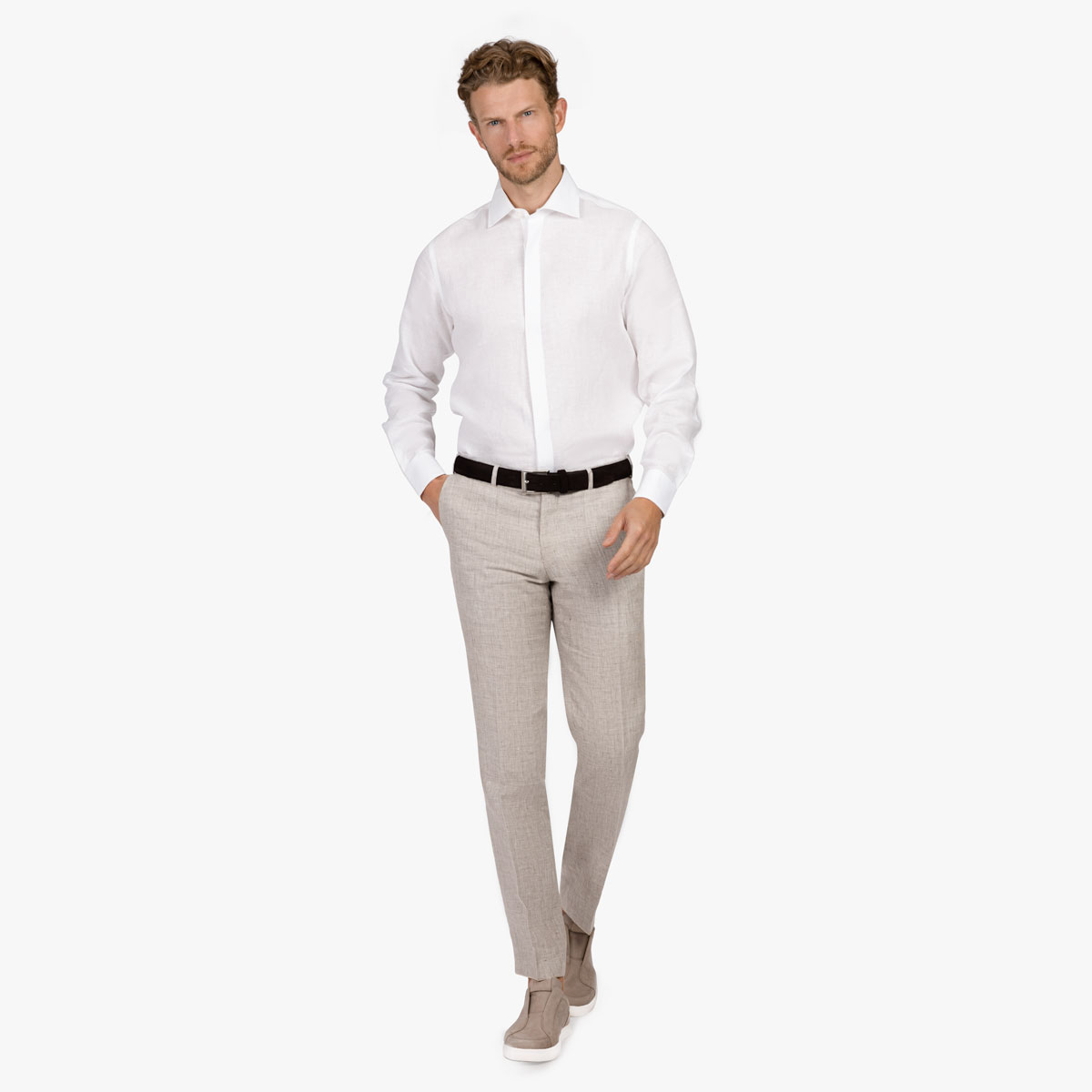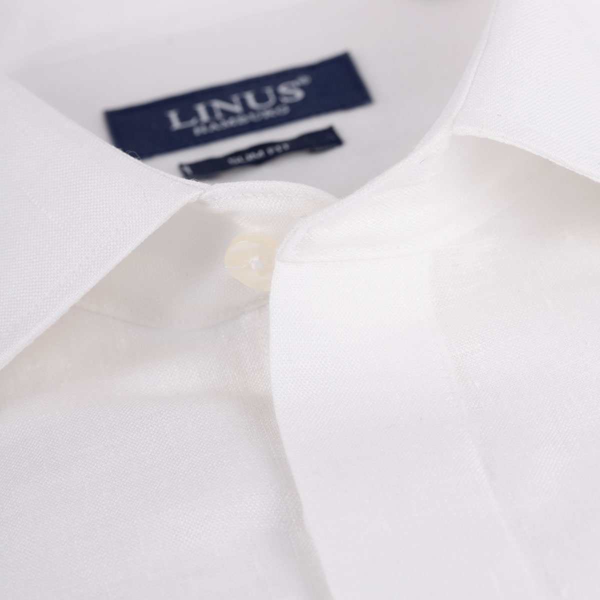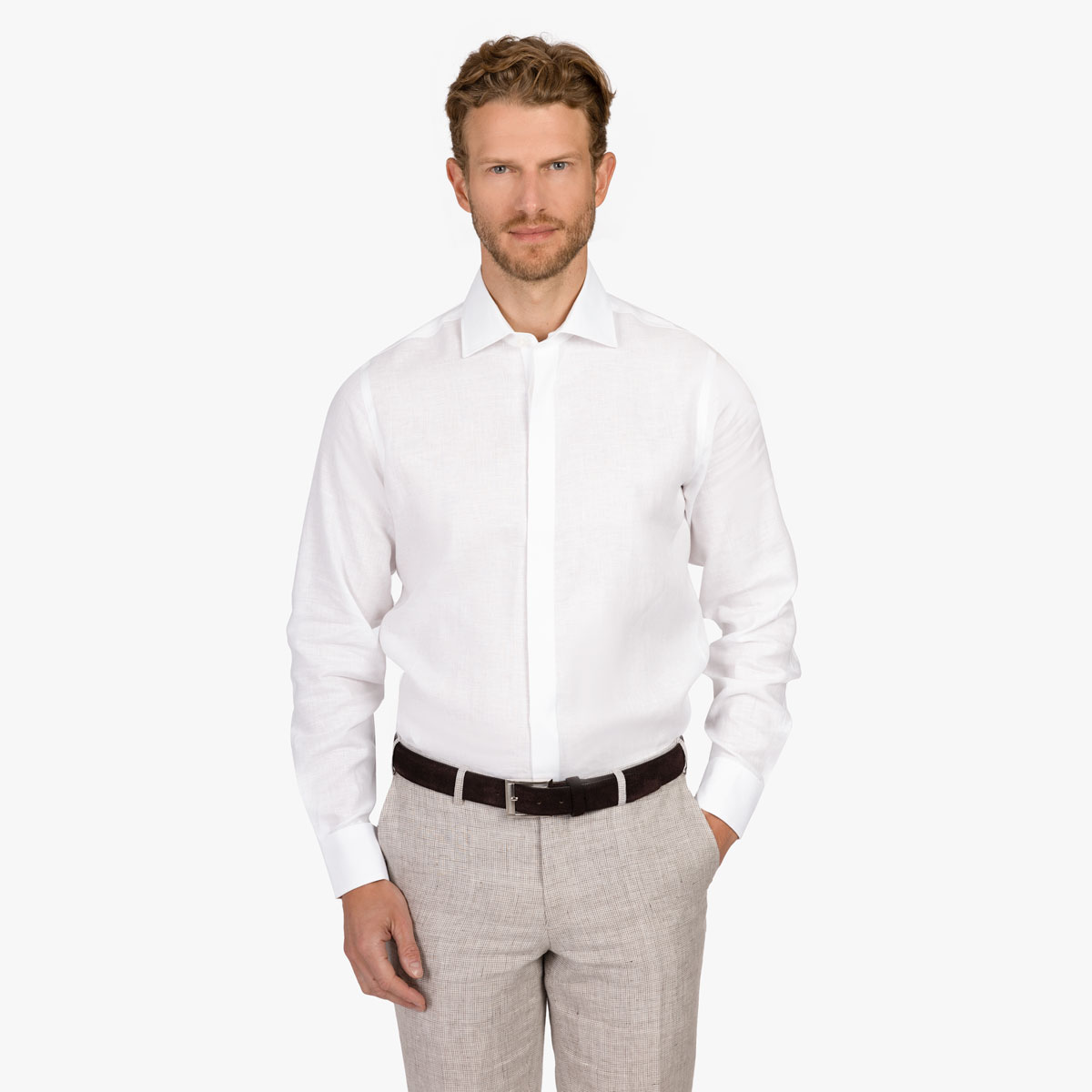 Dieses weiße Hemd besteht aus reinen Leinen. Es ist körperbetont geschnitten, hat einen Kentkragen und eine Sportmanschette. Zusätzlich hat das Hemd eine verdeckte Knopfleiste.