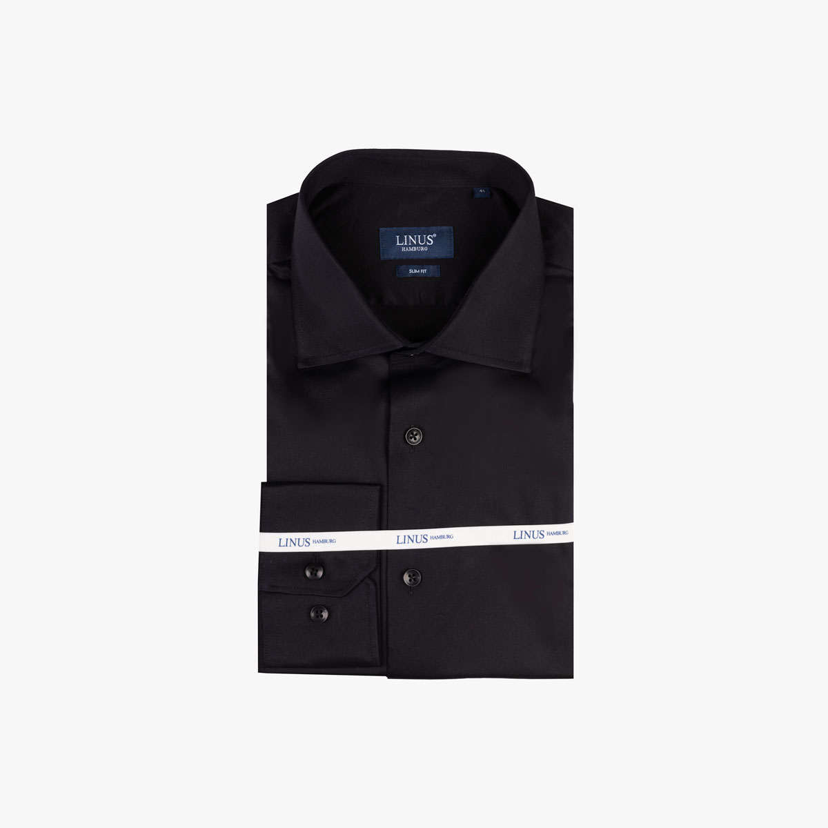 Das körperbetont geschnittene Hemd besteht aus einem Baumwolle-Elasthan-Mix und ist mit Kentkragen und Sportmanschette ausgestattet.